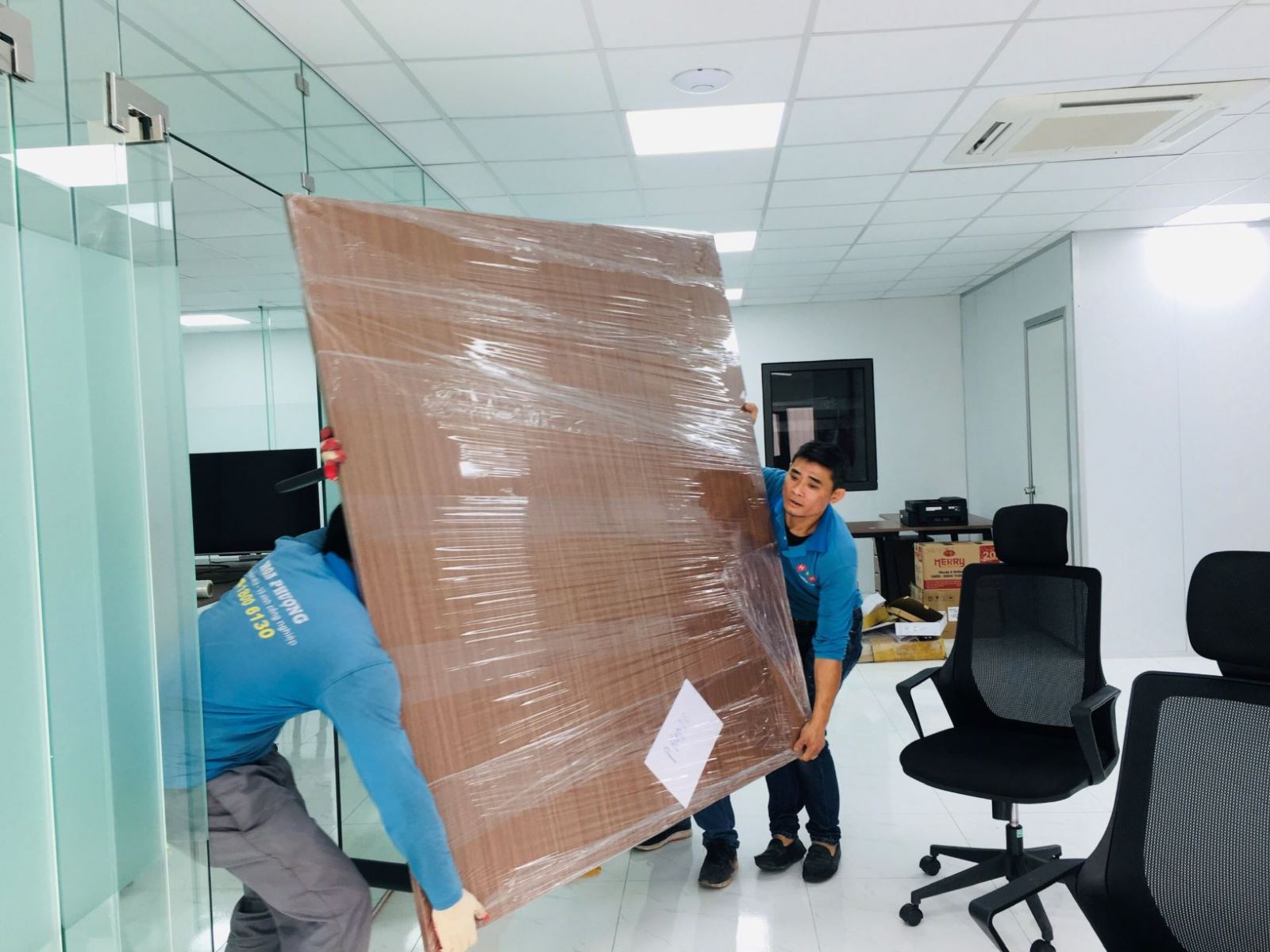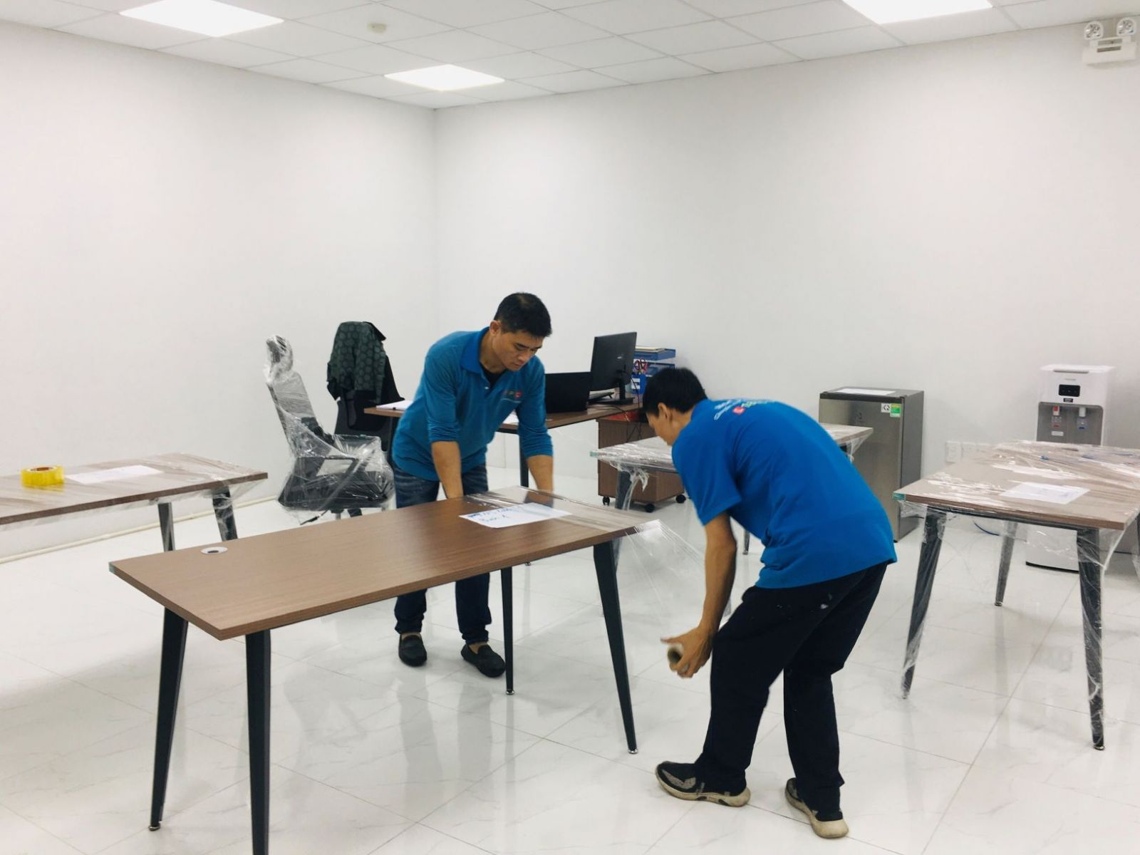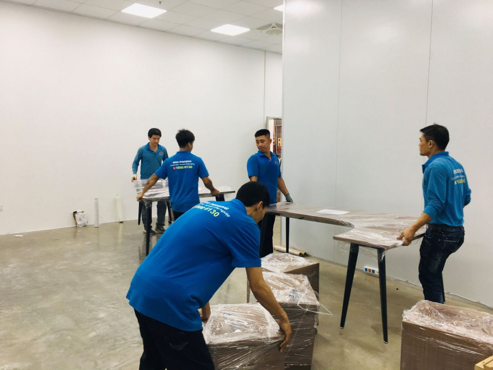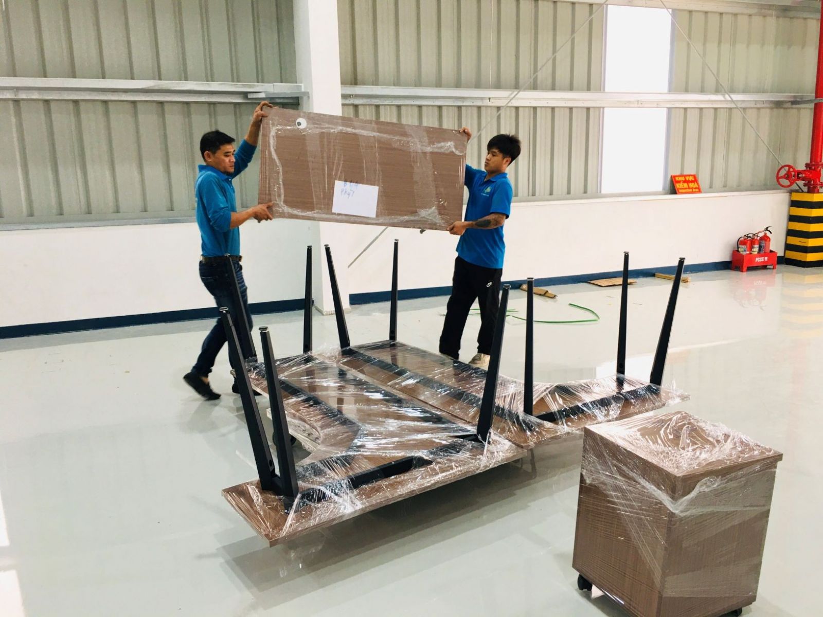- Tiến hành tháo dỡ bàn và gói trọn tủ, kệ, bàn ghế, gói bọc bằng màng PE và giấy carton rồi quấn băng keo chắc chắn.