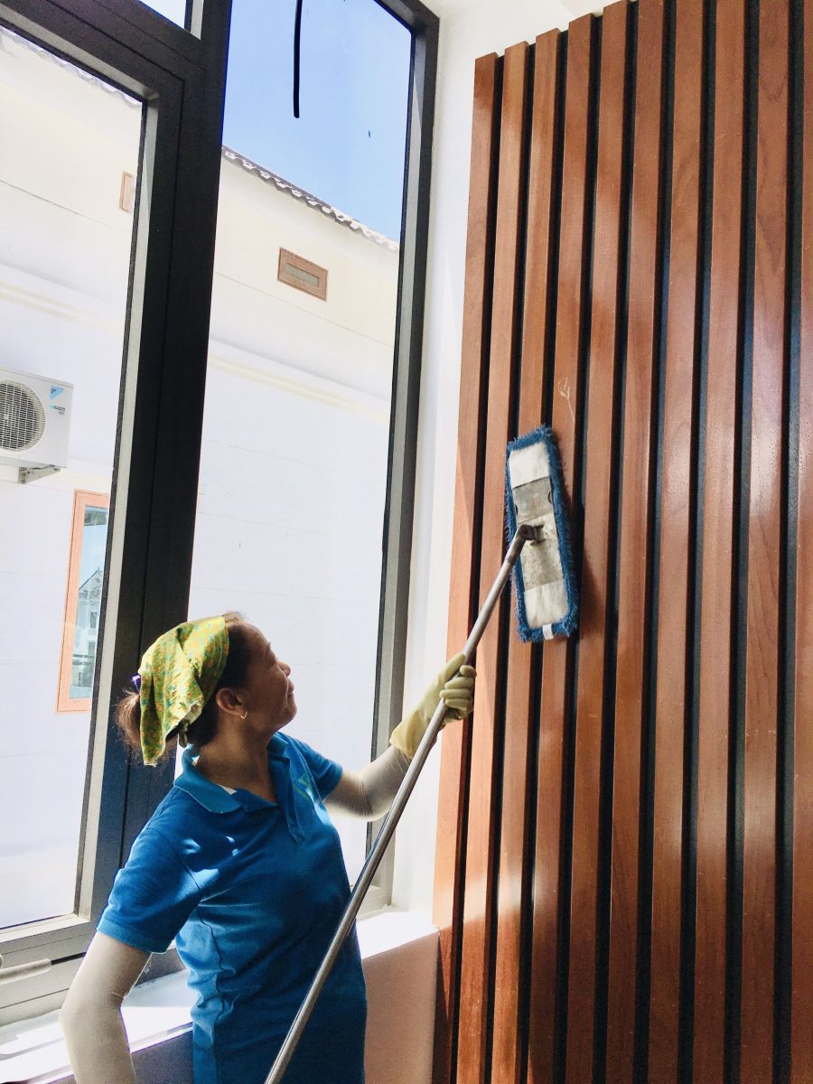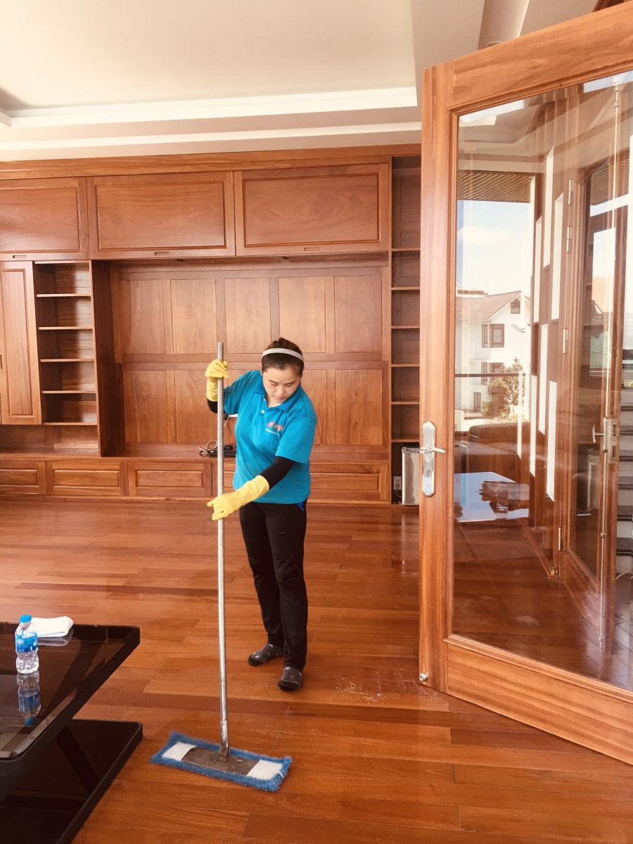 Hình ảnh thực tế của các công nhân Hoa Phượng làm vệ sinh công nghiệp tại Biệt thự Phúc Lộc: